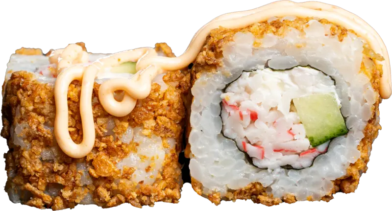 Krabų lazdelės, agurkas, sūrio kremas, svogūnų traškučiai, karai padažas