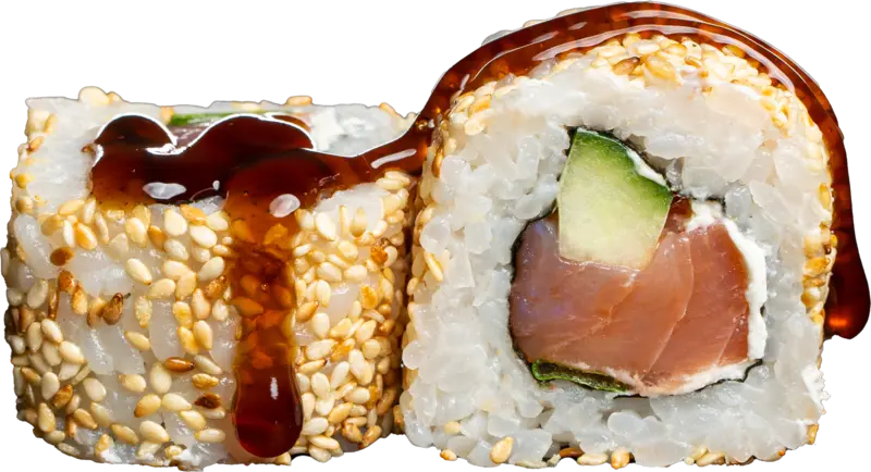 Rūkyta lašiša, agurkas, svogūnų laiškai, sūrio kremas, sezamo sėklos, terijaki padažas
